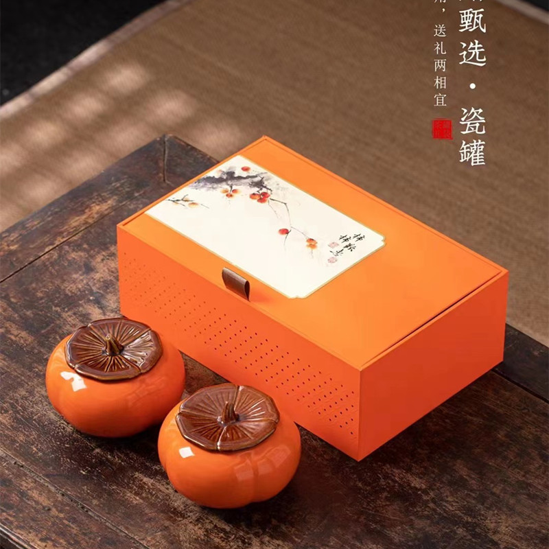 万事如意柿陶磁器茶葉缶密封缶紅茶緑茶1斤金糸楠木茶葉包装礼箱