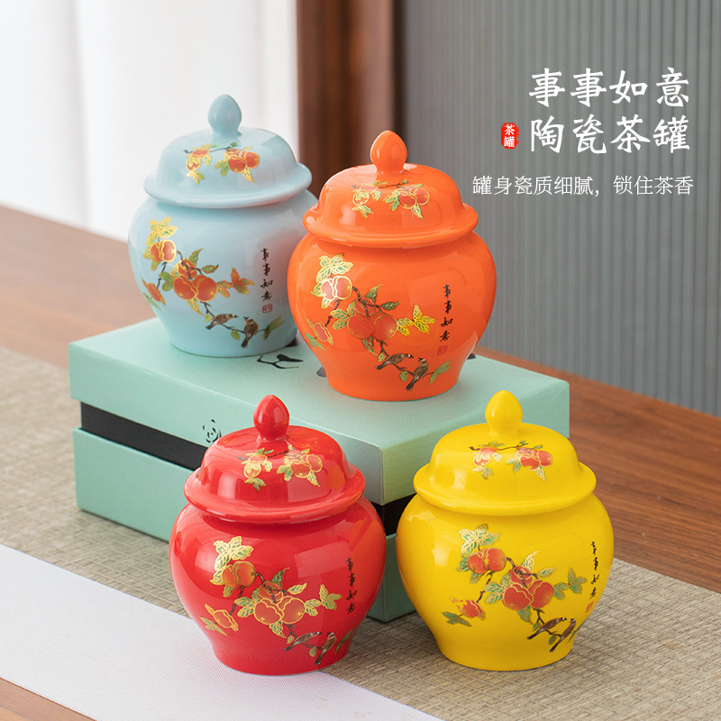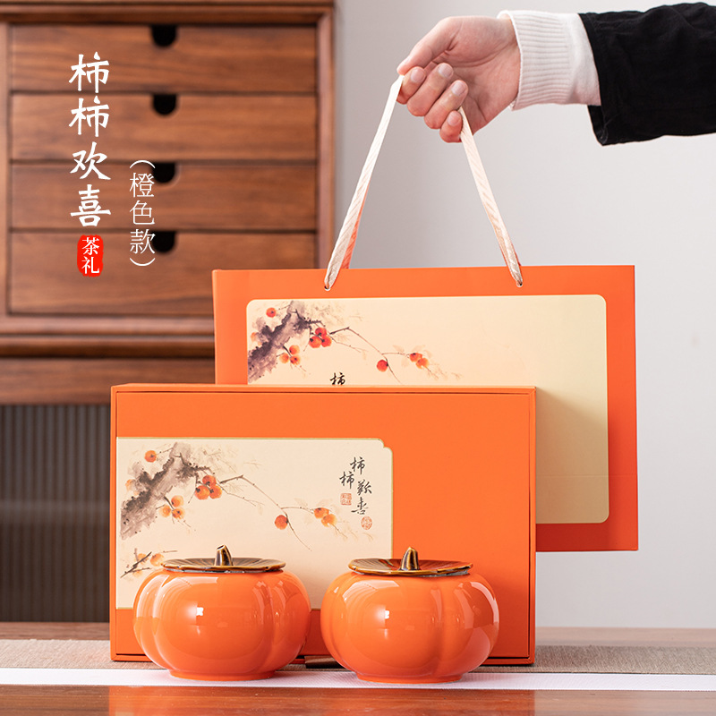 万事如意柿八二装紅茶緑茶陶磁器茶葉缶密封缶結婚祝い喜糖缶プレゼント礼箱