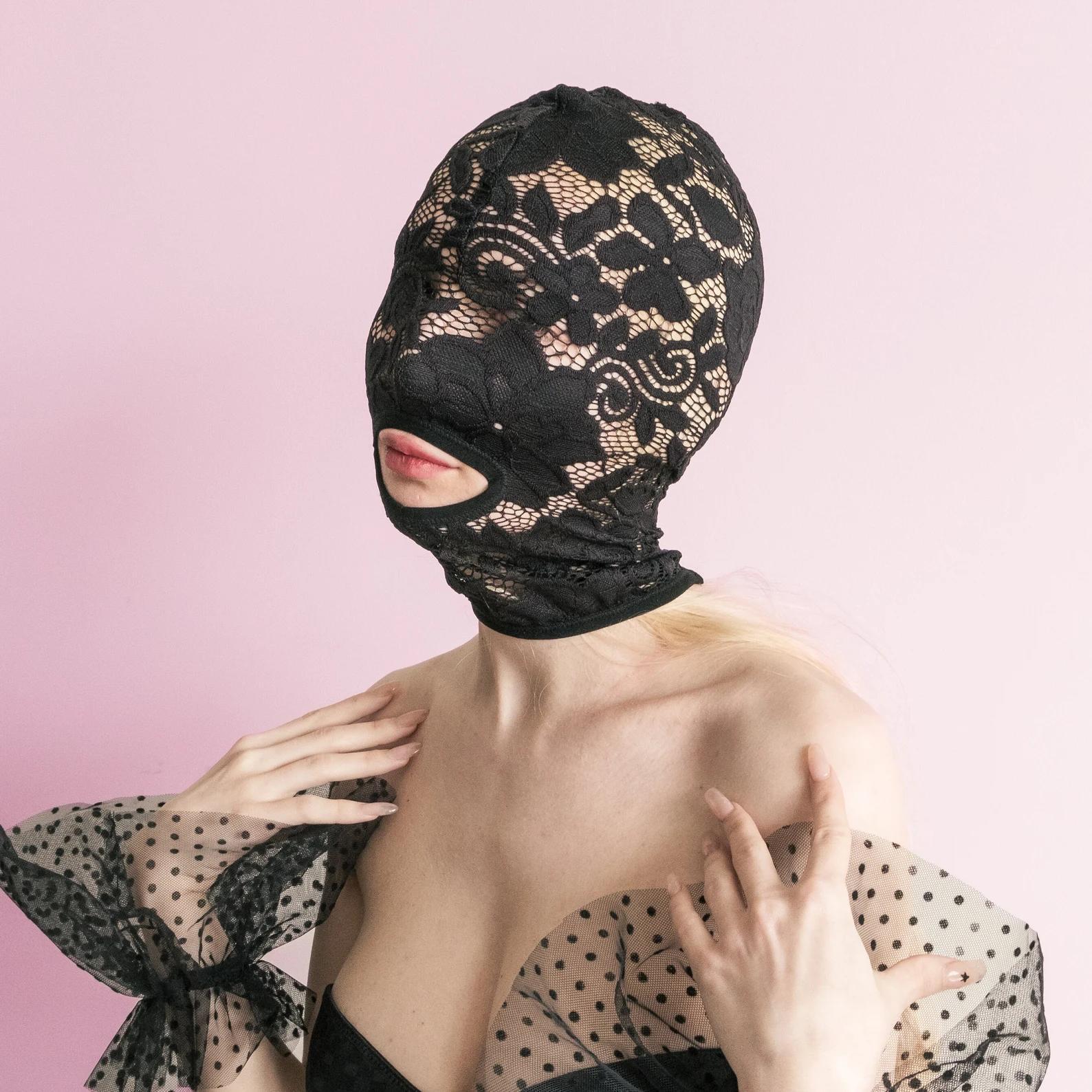 Sm趣味の覆面夫婦が成人のマスクをしてセクシーなレースの通気性の頭の舞踏会の役は成人の用品を演じます。