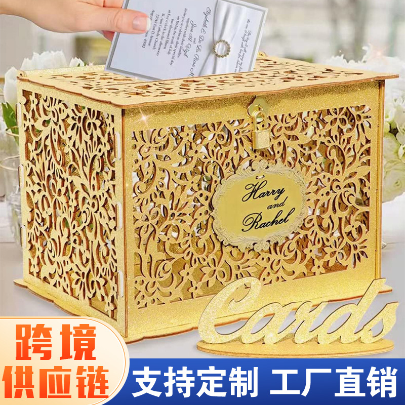 ロック付き光沢のある木制のカードボックス、ギフトカードボックスお金のための黄金の结婚式のカードボックス