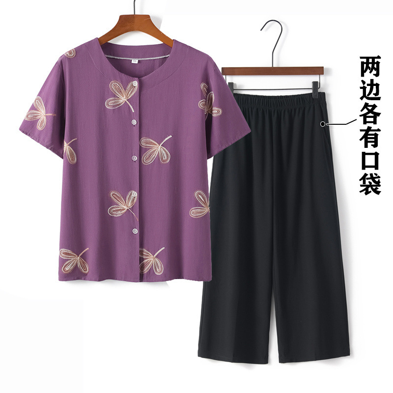 高齢者服、夏スーツ、ママ服、半袖シャツ、中高年女性トップス、おばあちゃん綿絹2点セット
