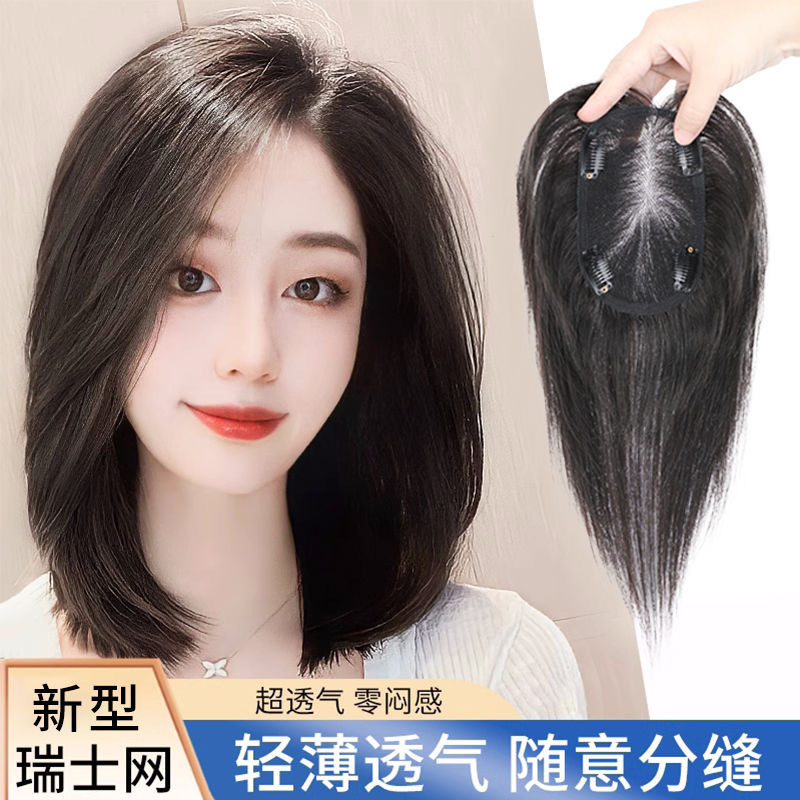 スイスネットの頭の上で髪を補います。ふわふわしていて、量を増やして白髪を隠します。