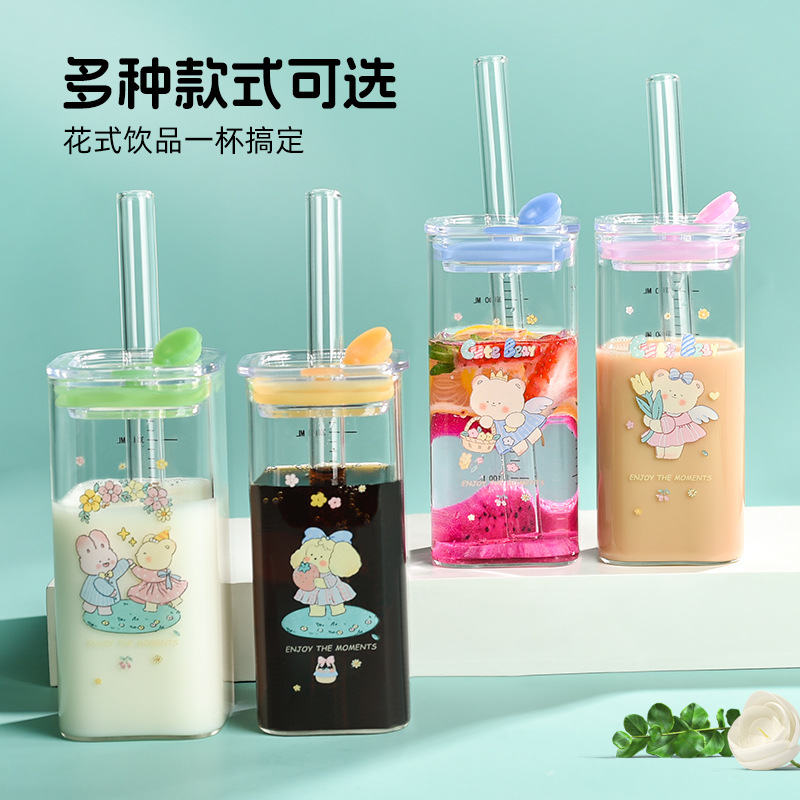 新型ガラスカップファッションストローカップ耐高温グラス携帯少女かわいい高颜値ミルクカップ