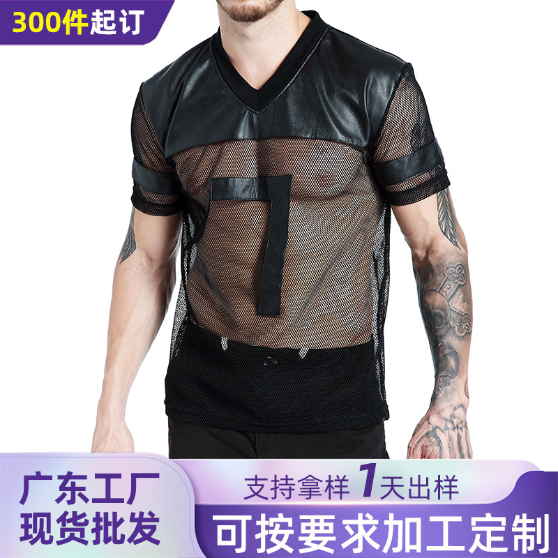 欧米の外国貿易の男性は本革のtシャツの通気性のランニングネットの穴のtシャツをまねてレジャーのスポーツのvネックのtシャツfr013をつなぎます。