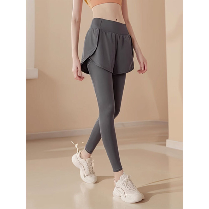 春のタイプのベルベットの偽の2つのヨガのズボンの女性の腰の高い尻の速乾のランニングのズボンの弾力のスキニーのズボン