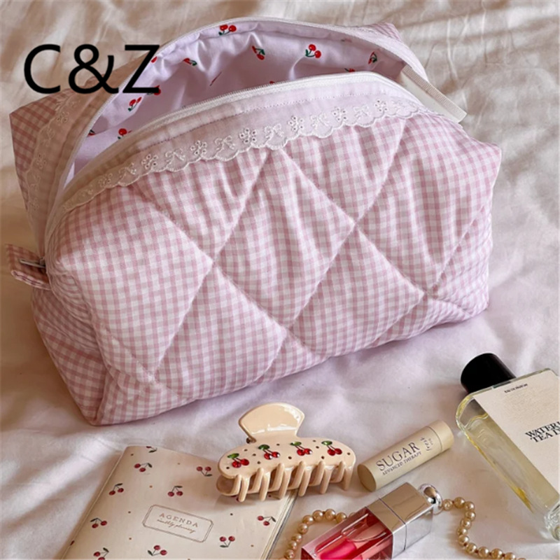 クロスボーダーの人気布芸レースの格子化粧バッグ旅行の携帯格子縞のスキンケア商品は綿の収納袋を挟みます。