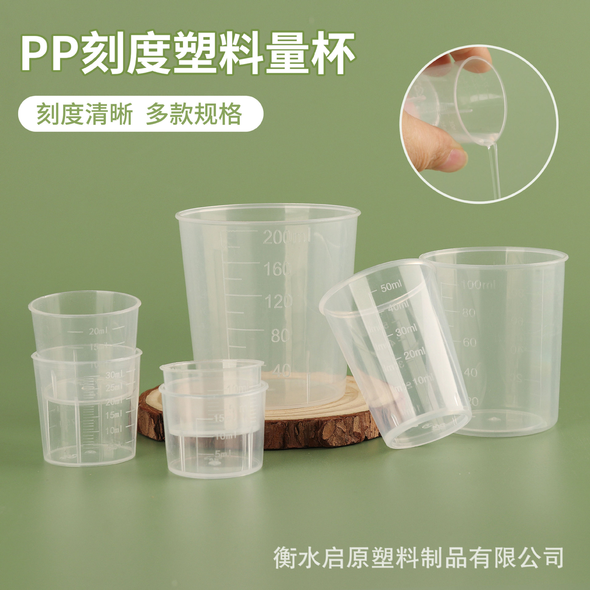 メーカーの透明な小さな計量カップ、スケール付き、平らな口、PPプラスチック製、化学実験用化学薬品計量カップ