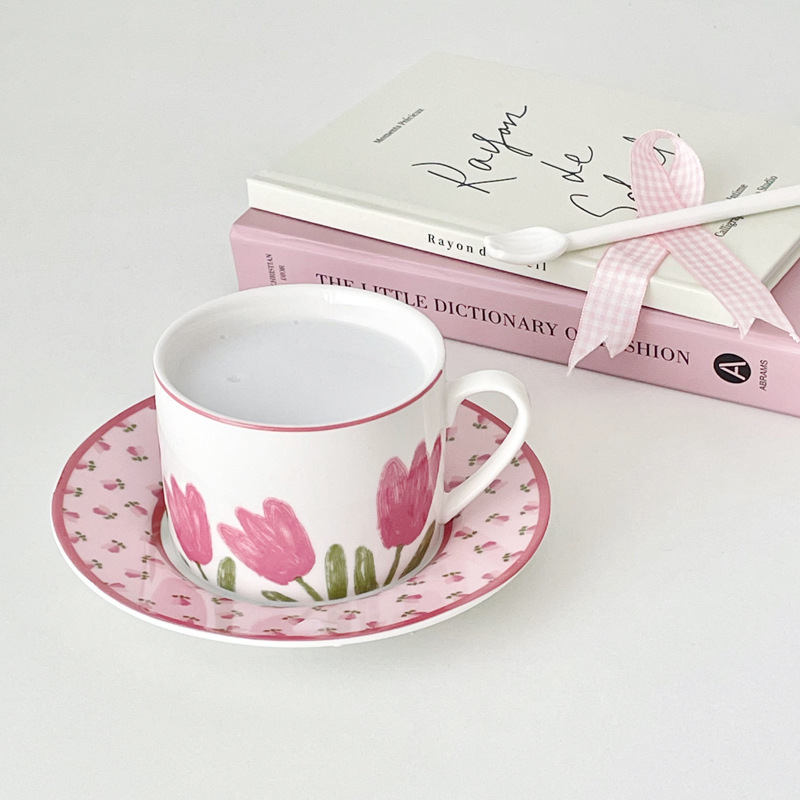 Slow as Old-Pink Tulip セラミック コーヒー カップとソーサー セット 韓国フレンチ アフタヌーン ティー カップ
