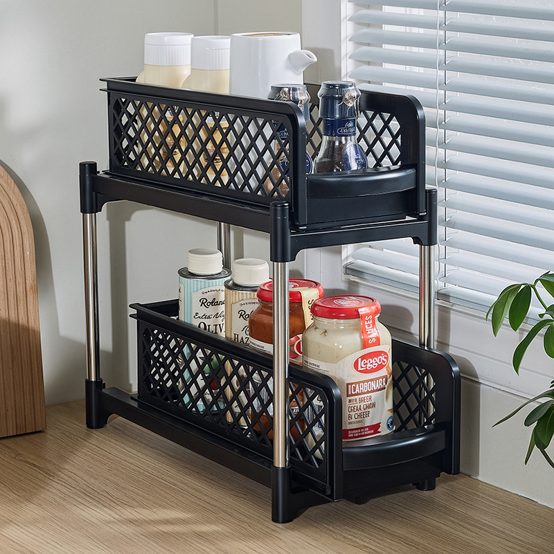 キッチン引き出し式シンク下収納ラックプラスチック中空オーガナイザー二層引き出し式カウンタートップ滑り止め収納ラック