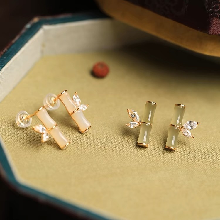 喜飾銀匠925純銀新中国式古風竹節ピアス女性レトロ高級感気質和田玉耳飾り