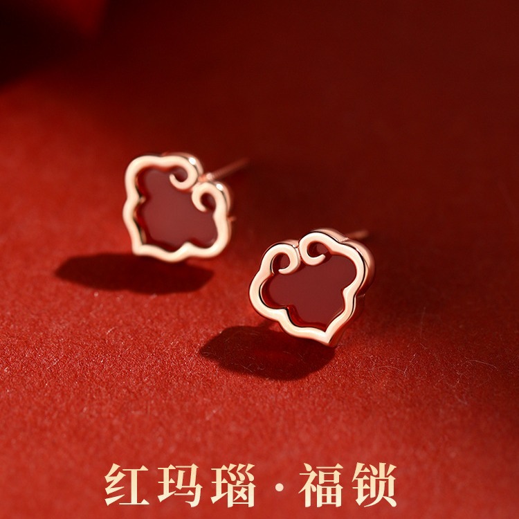 喜飾銀匠925純銀如意鎖ピアス女2024新型起爆赤いイヤリング新年プレゼント代発