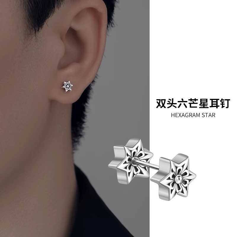 喜飾銀匠999純銀欧米風ピアス高級感ダブルヘッドネジ耳骨釘レトロ六角星ピアス