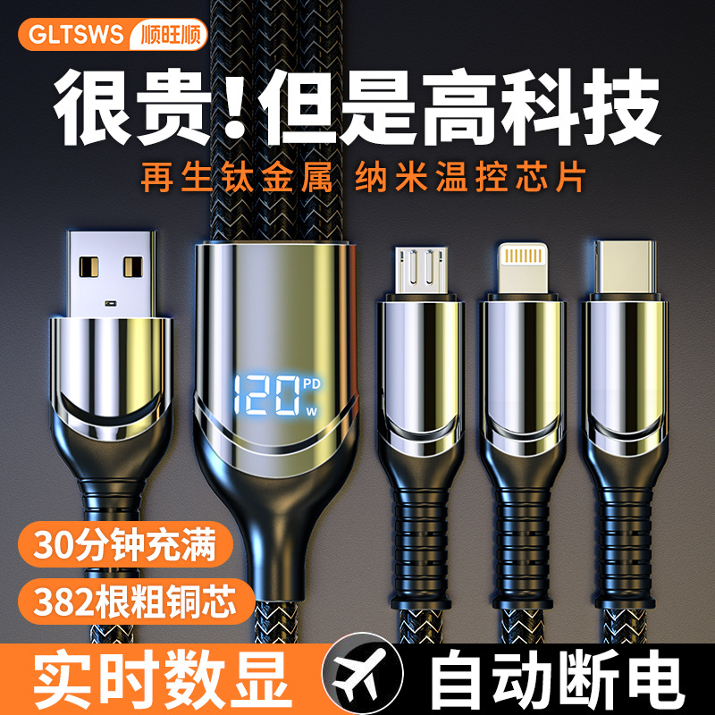 120w知能デジタル表示三合一データ線超急速充電は華為リンゴ15米安卓充電線に適用される