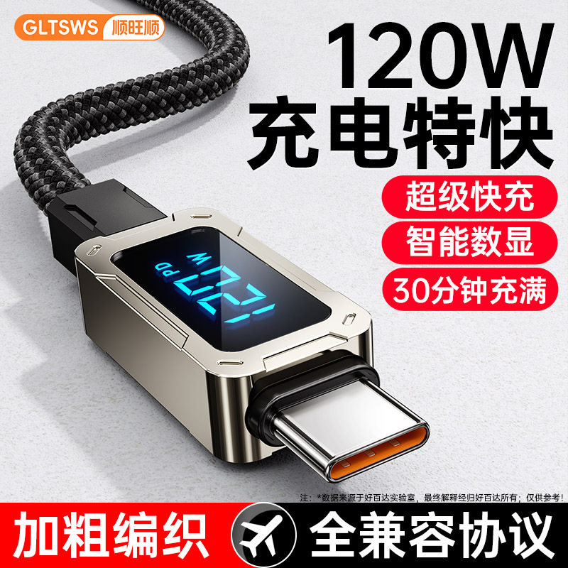 Shunwangshun インテリジェントデジタルディスプレイ 120W 超高速充電スリーインワンデータケーブル PD Apple および Huawei 携帯電話の充電に適しています