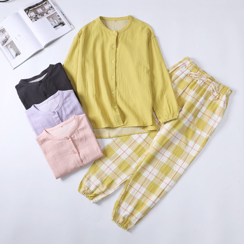 春の夏の新型カップルの綿の二重の紗のクレープのパジャマのスタンドカラーの純色の無側縫いの純綿の家の服