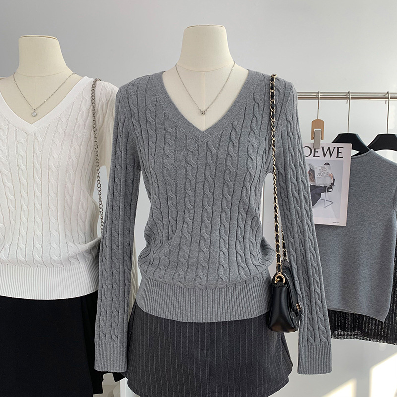 グレーvネックセーター女性秋冬新作学院風長袖麻花感小衆シンプルニット上着