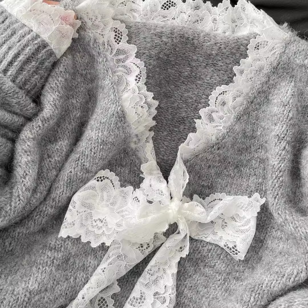 レースの蝶結びはゆったりした長袖のセーターの女性2025秋の新型の怠惰な風の甘いニットの上着をつなぎ合わせます。