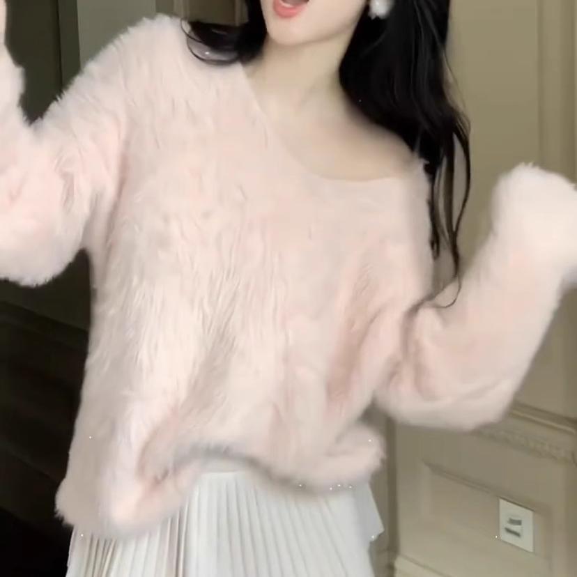 秋冬の新型の白い毛の保護のミンクの毛のセーターの中で長いタイプの頭のvネックのニットの怠惰でゆったりしている上着の女性