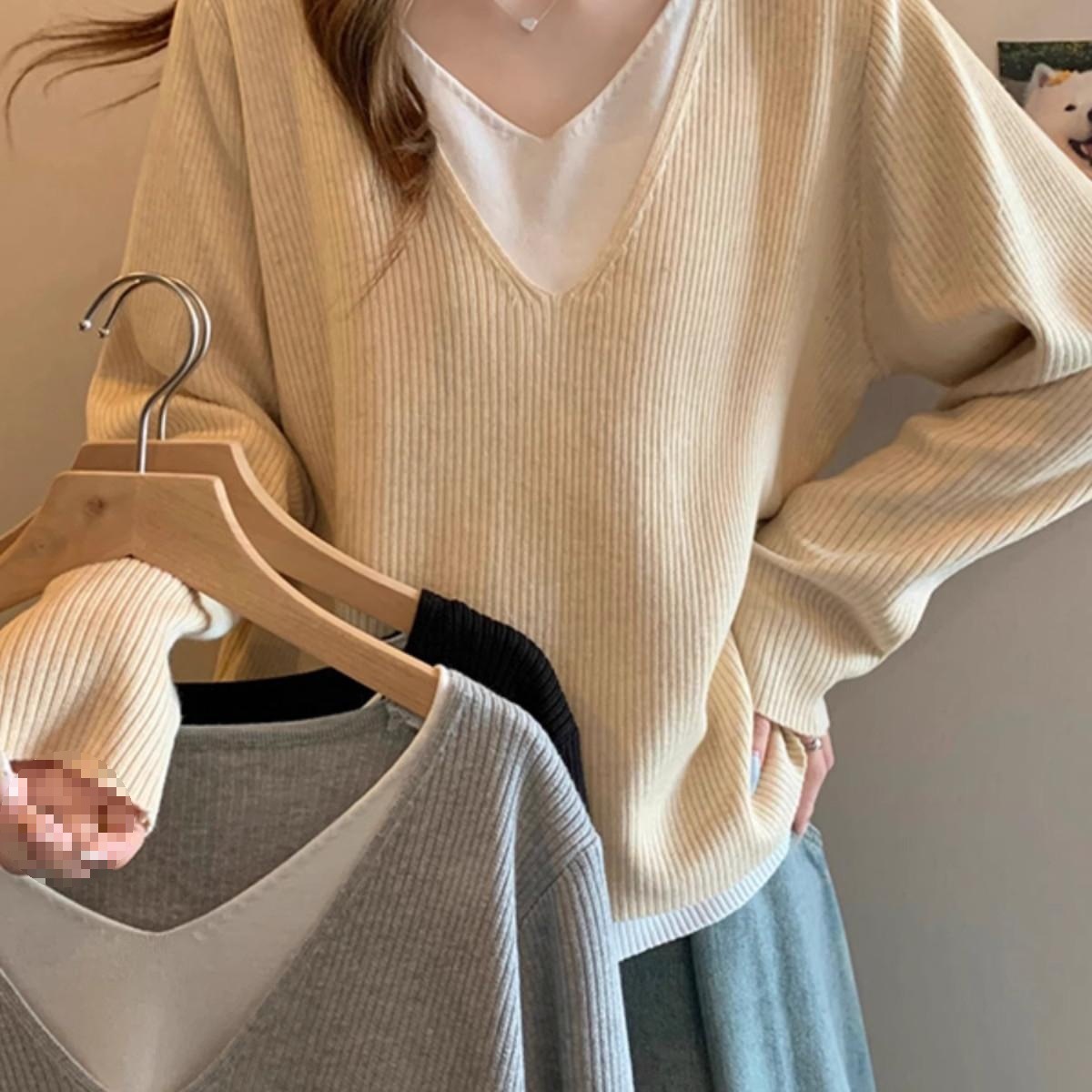 大きいサイズの太ったmmの長袖の偽の2つの色のニットの女性の秋冬の新型のvネックの底のシャツはやせてゆったりしている上着を現します。
