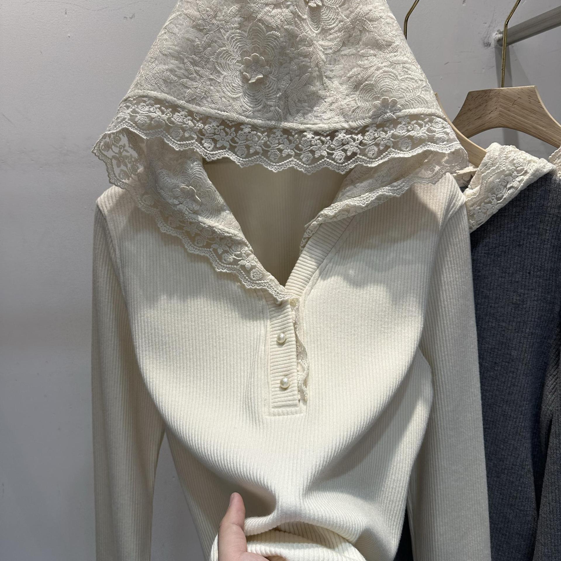 レースのつなぎ合わせは帽子の長袖のピットの毛のtシャツの女性の2025朝の春の服装の新型の甘いクールな底のシャツの上着をつなぎます。