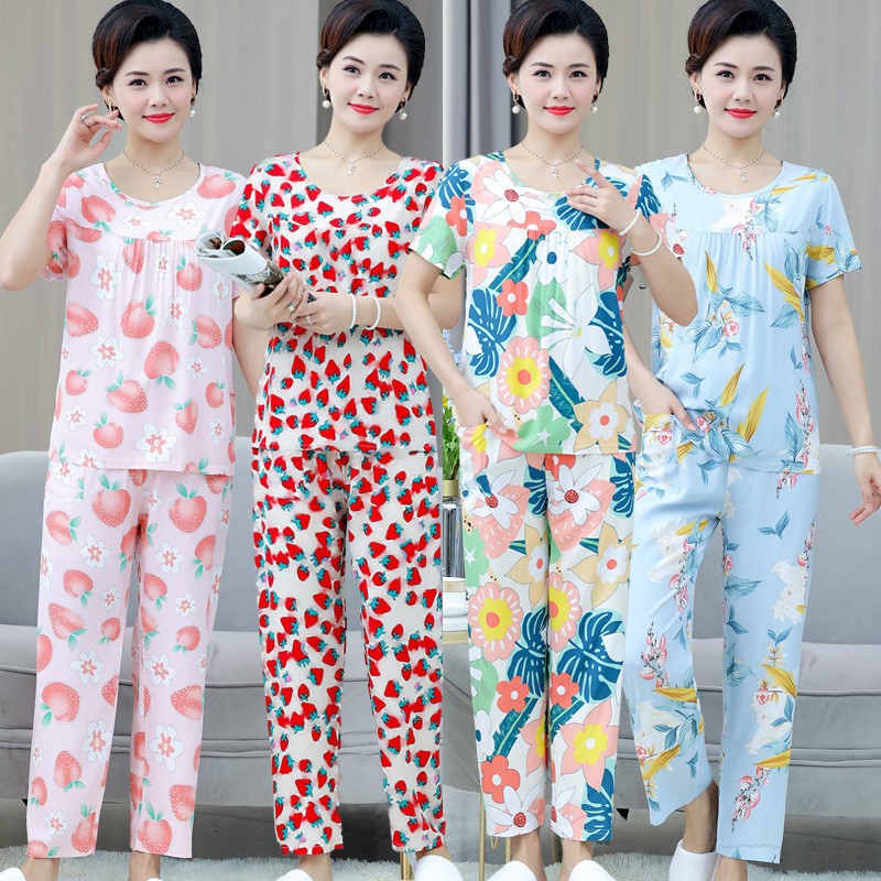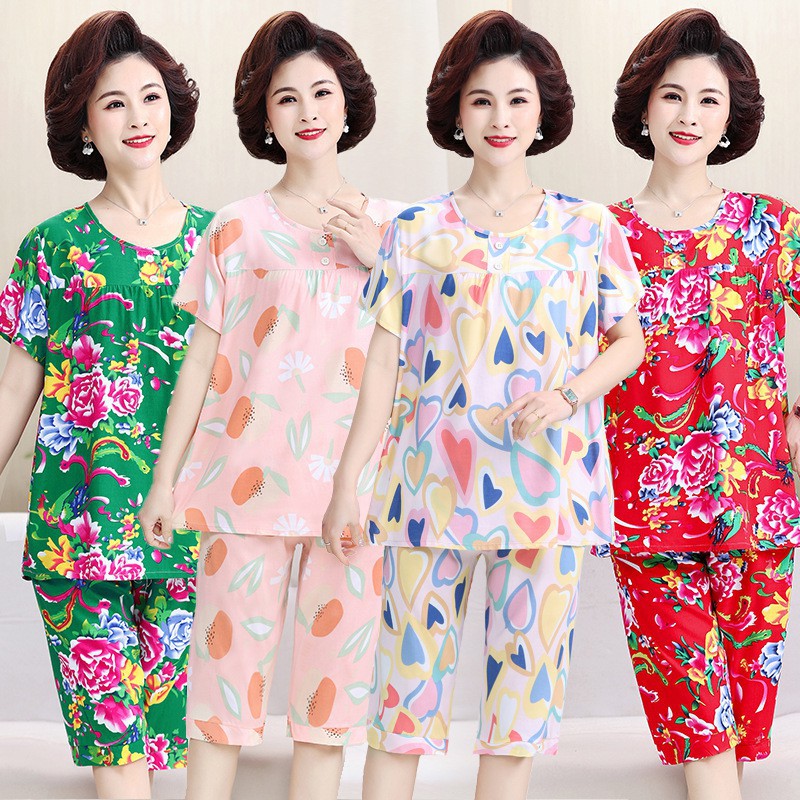 夏の婦人服の薄いパジャマセットのお母さんは人工綿の家庭服を着ます。