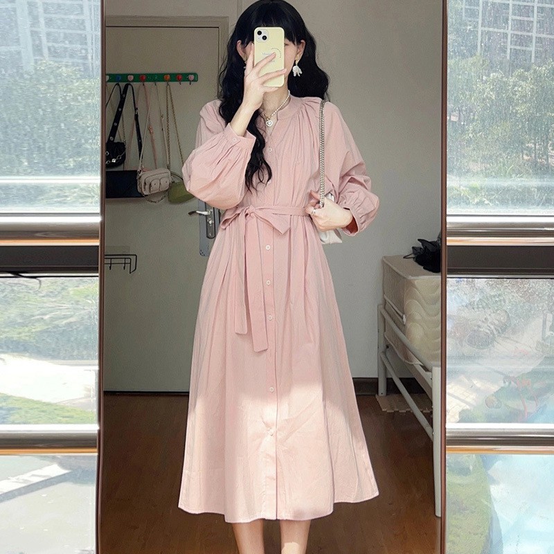 新商品の春の初春のフランス式のお茶は腰を締めてシャツのスカートの女性の気質の優しい風のピンクのワンピースのスカートを結びます。