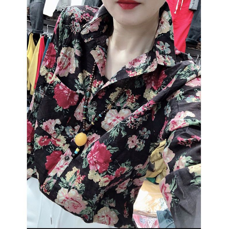 レトロな長袖の花の綿麻のシャツの女性はゆったりしていて、やせています。