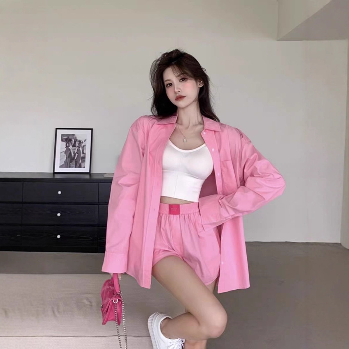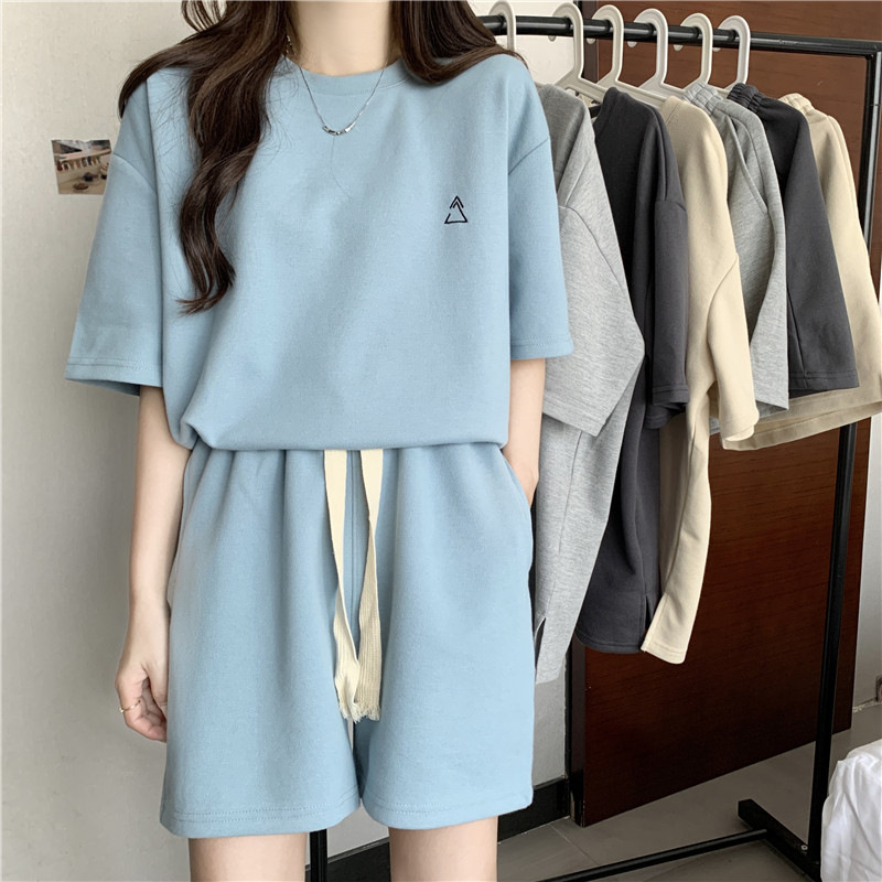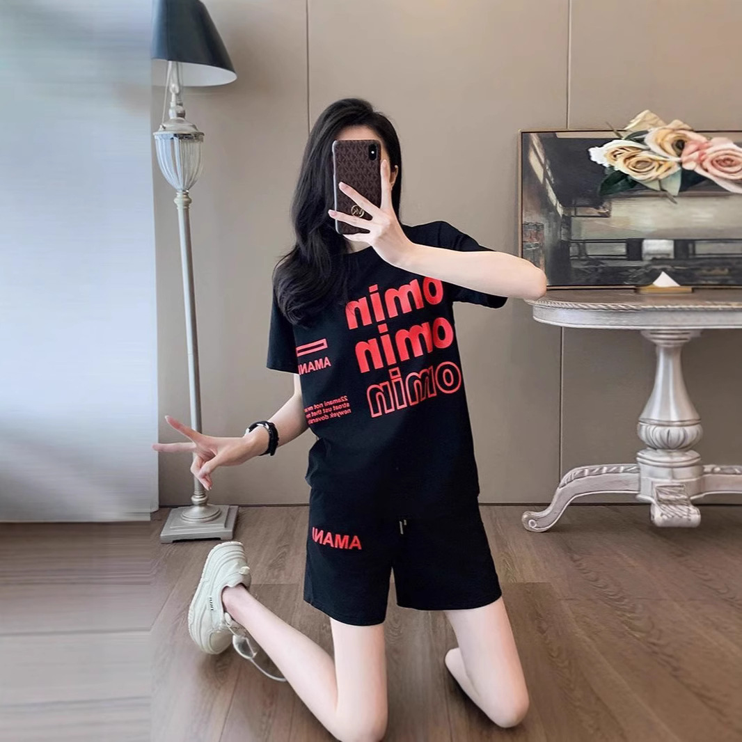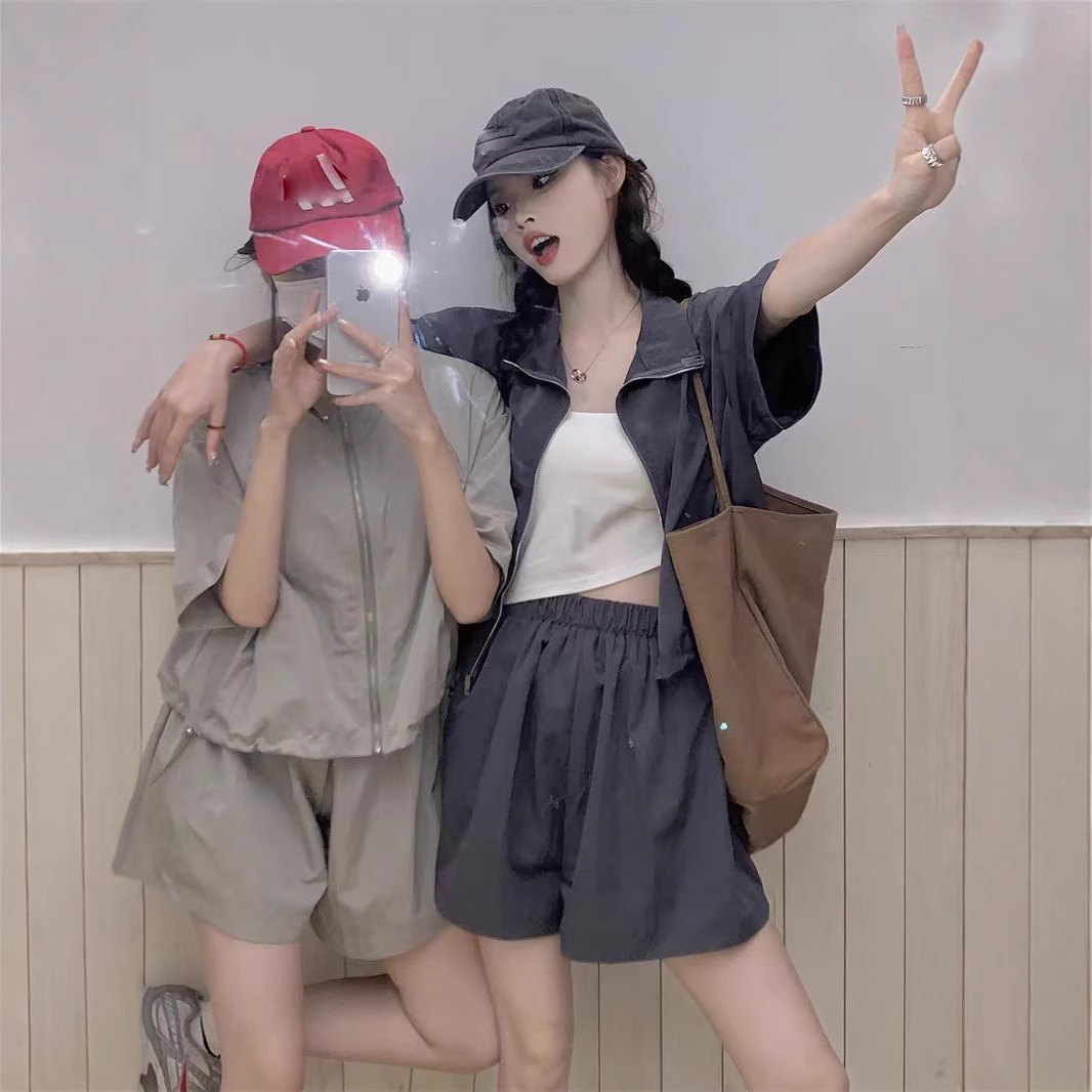 香港風アメリカレトロ小柄カジュアルスーツ女性夏ゆるいインスタ風半袖ショートパンツスポーツ2点セット潮