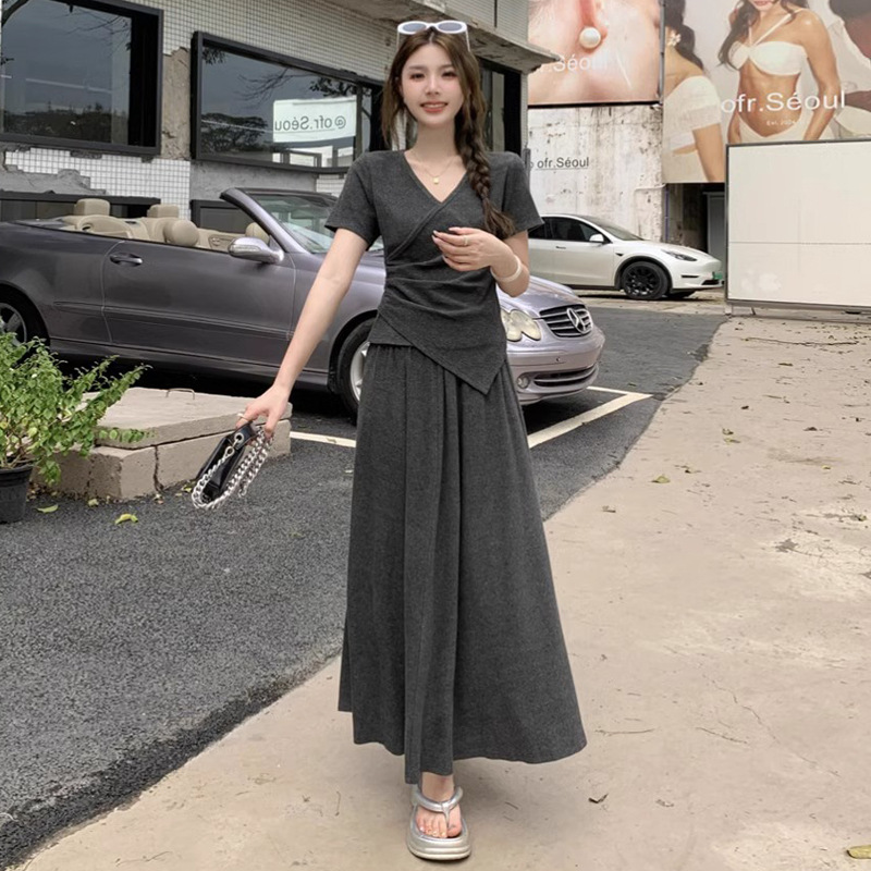 大きいサイズの婦人服の太ったMMの夏のタイプはやせてカジュアルで不規則な半袖の上着の半身のスカートのお茶系はスーツの長いスカートを着ます。