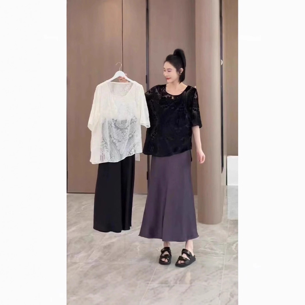 夏のシルクのベルベットの高級感の透かし彫りの小さい透き通ったtシャツの半袖のシャツ