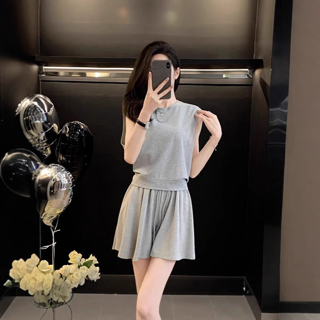 軽熟レジャースポーツスーツ女性夏2025新型灰色袖なし上着高腰半ズボン2点セット