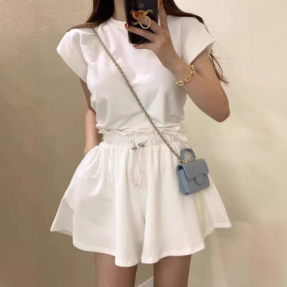 韓国シックな夏ニッチ気質バックスリットストラップ半袖Tシャツトップ+巾着ワイドレッグショーツ2点セット