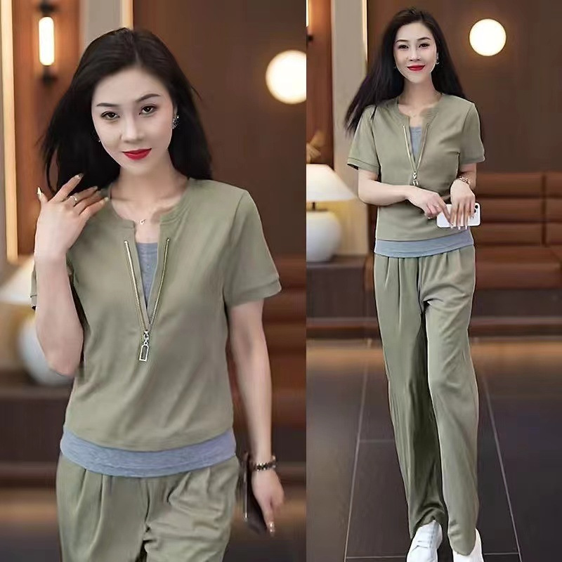 女性のための半袖カジュアルスポーツスーツ 2025 夏の新しいファッション年齢軽減休暇ツーピーストップストレートパンツツーピースセット
