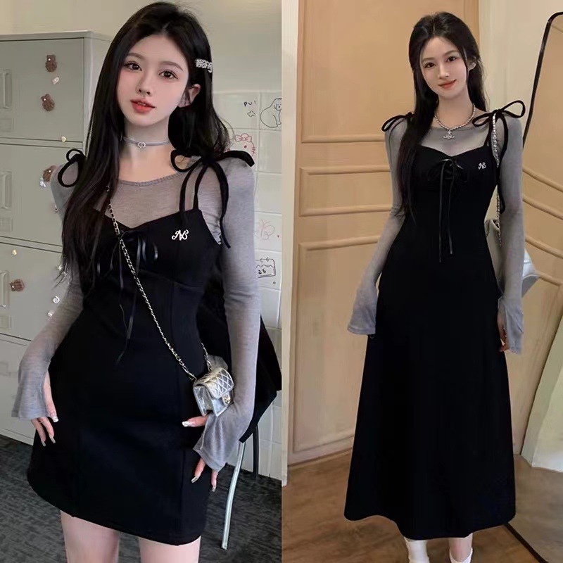 ヘボン風の黒いストラップのワンピースの子供の秋の2024の新型の小さい子供は高級感のスーツのロングスカートに乗ります。