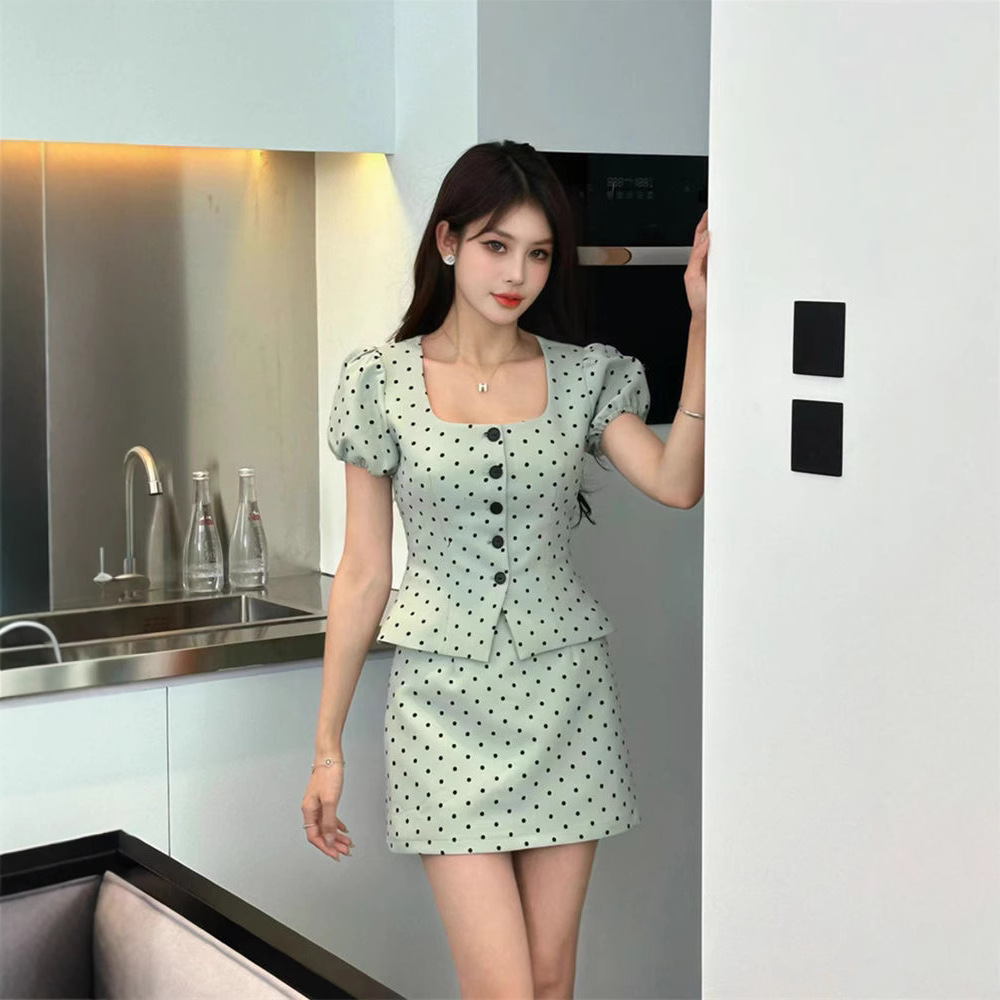微太ったmm小香風点セットの女性の小衆が身を修めてやせている半袖の上着の高腰の半身のスカートの2つのセットの潮が現れます。