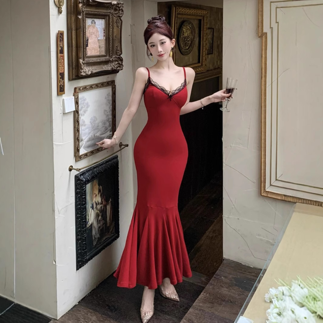 純粋な欲望セクシーな甘いレディレース V ネックサスペンダードレス女性の夏の気質タイトなワンステップフィッシュテールロングスカート