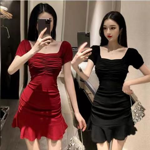 2025 新しい夏の女性のファッショナブルでセクシーなスクエアカラーローカットプリーツタイトフィットヒップハイストレッチ半袖ドレス