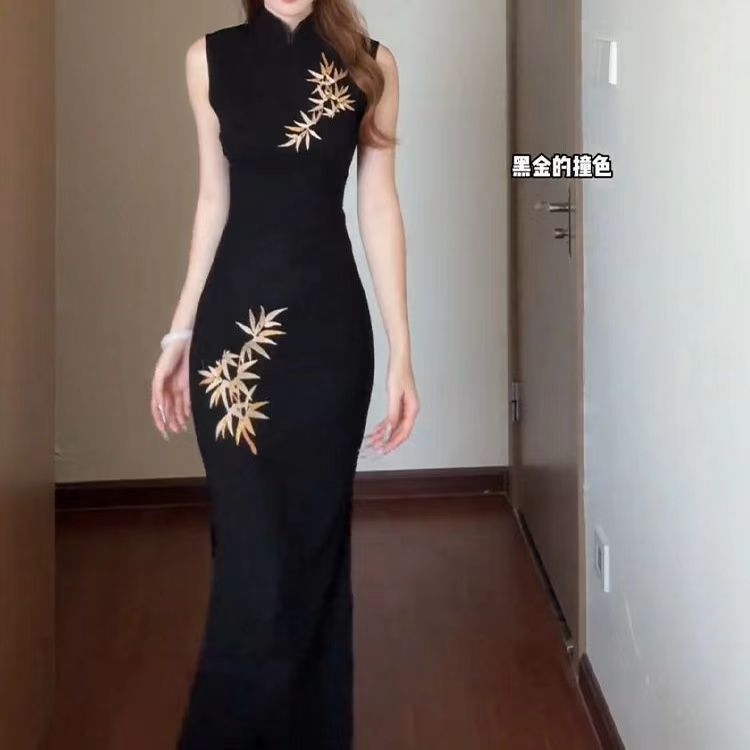 新しい中国式の改良チャイナドレスのノースリーブベストのワンピース女性の夏の黒いオープンフォークは腰の中の長いお尻のスカートを収めます。