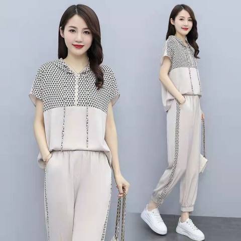 女性用夏半袖スウェットシャツ、おしゃれな年齢軽減フード付き、コントラストカラーで肉感カバー、着痩せ、カジュアルスポーツハーレムパンツ2点セット