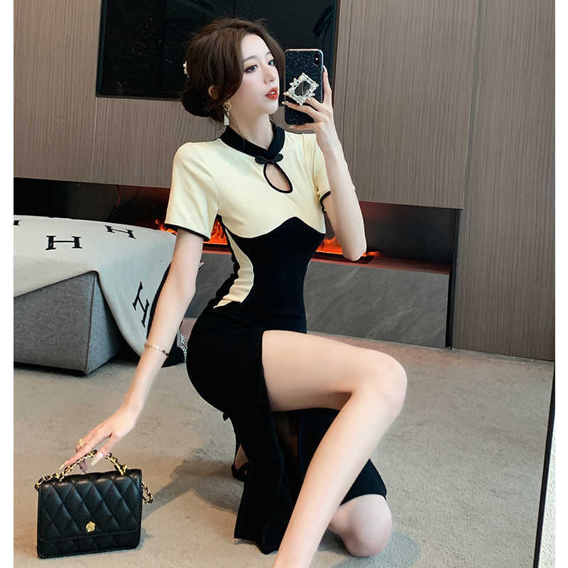 新型チャイナドレスの女性夏の新型2025年に若いタイプの少女のセクシーな衝突色の修身を改良しました。