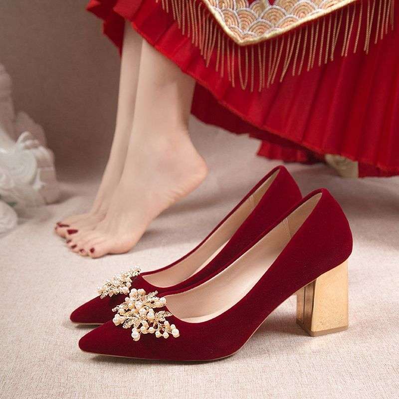 Xiuhe 花嫁の結婚式の靴 2025 春と秋の新ワインレッド厚いヒールの結婚式の靴女性の乾杯宴会ハイヒールのウェディングシューズ