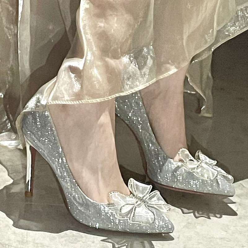 日本クリスタルシューズ 2025 春と秋の新シルバー結婚式の靴ラインストーンリボンポインテッドトゥハイヒールの女性のスティレットシューズ