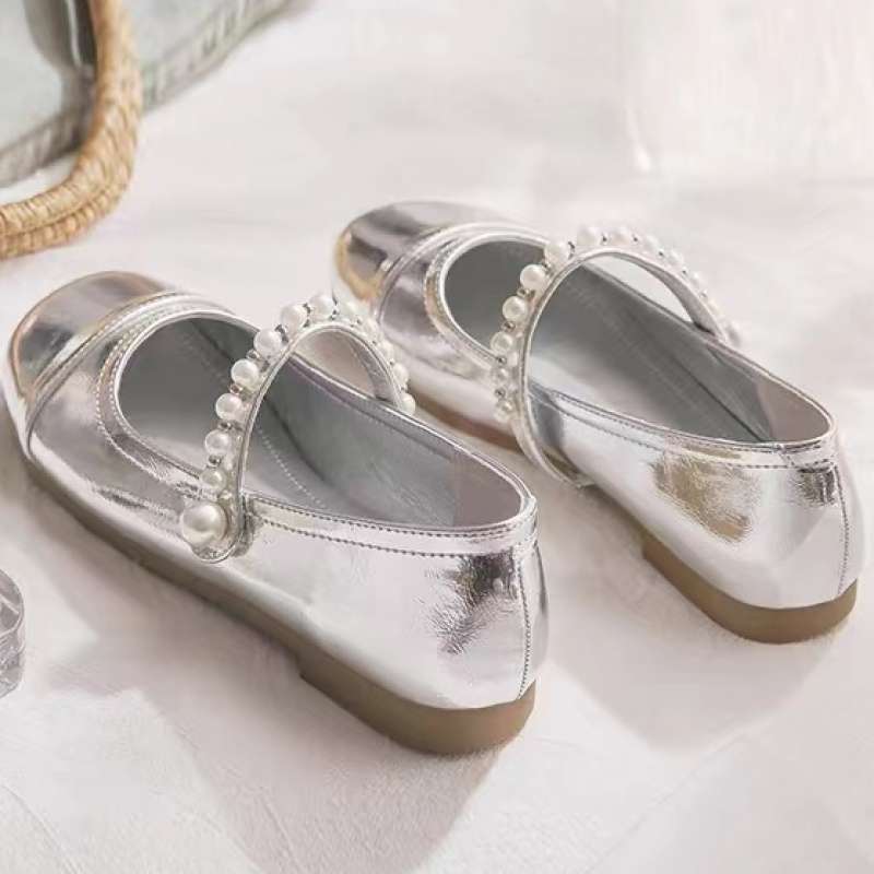 レザーバージョン~メリージェーン婦人靴春フレンチフラットイブニングスタイル優しいスカート付き女性用浅口シルバーシューズ
