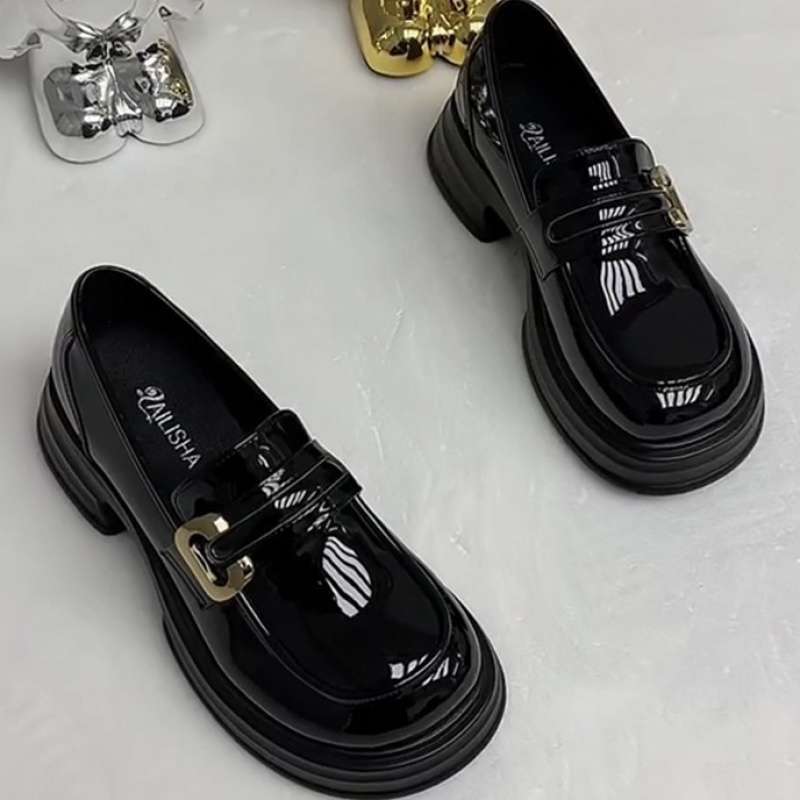 黒の厚底レザーシューズ女性用英国2025春新作レトロJK制服靴高め厚底ローファー