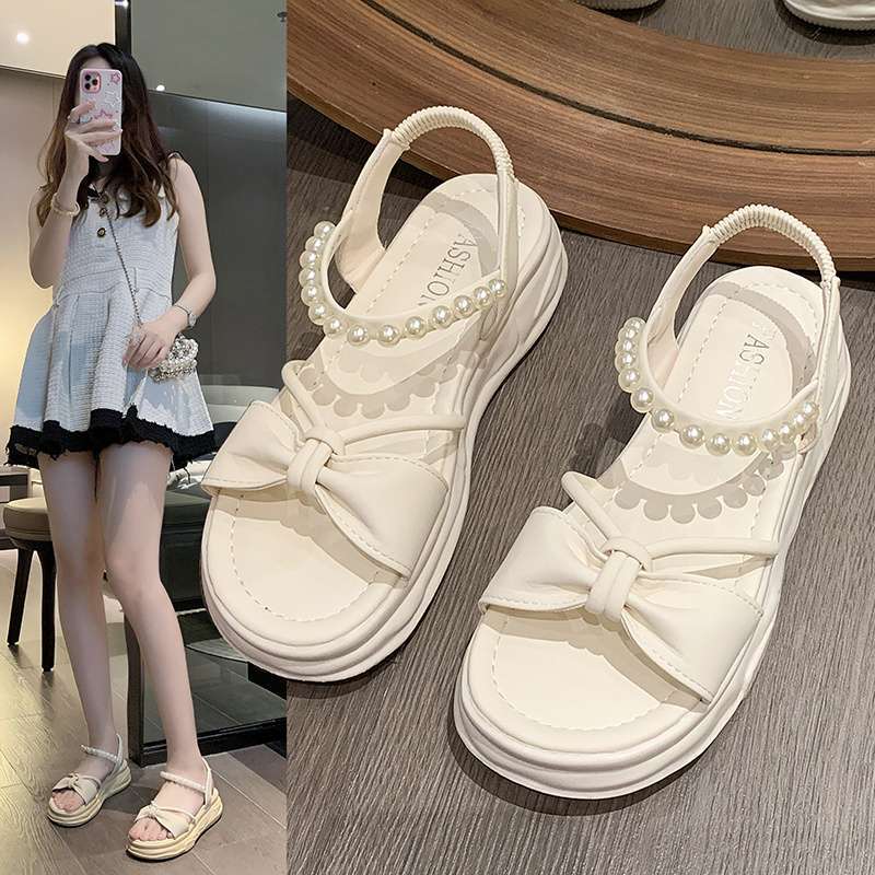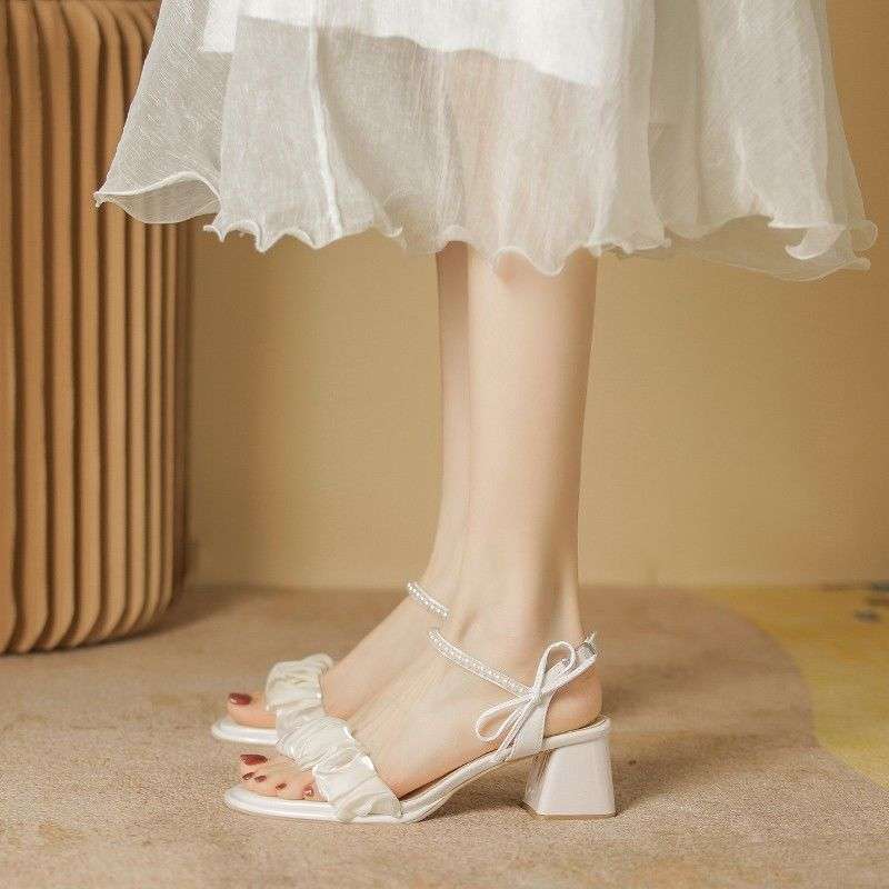 フレンチハイヒール、新しいハイエンドスーパーフェアリーパールリボンファッションワンラインバックル夏スカートサンダル女性用