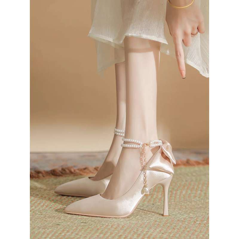 パールストラップハイヒールウェディングシューズ Hexiu ウェディングドレスツーウェアポインテッドトゥ婚約結婚式ブライダルシューズ 2025 秋