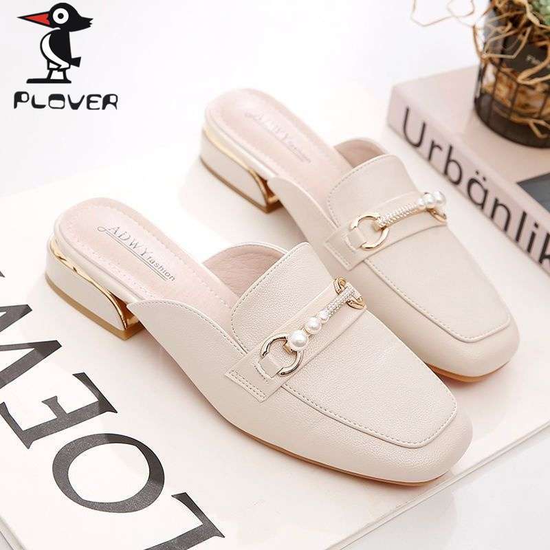 包頭ハーフスリッパ女性のアウターウェア 2025 新しい夏のファッション厚いヒールスクエアトゥ小さな革靴ミュラーサンダル