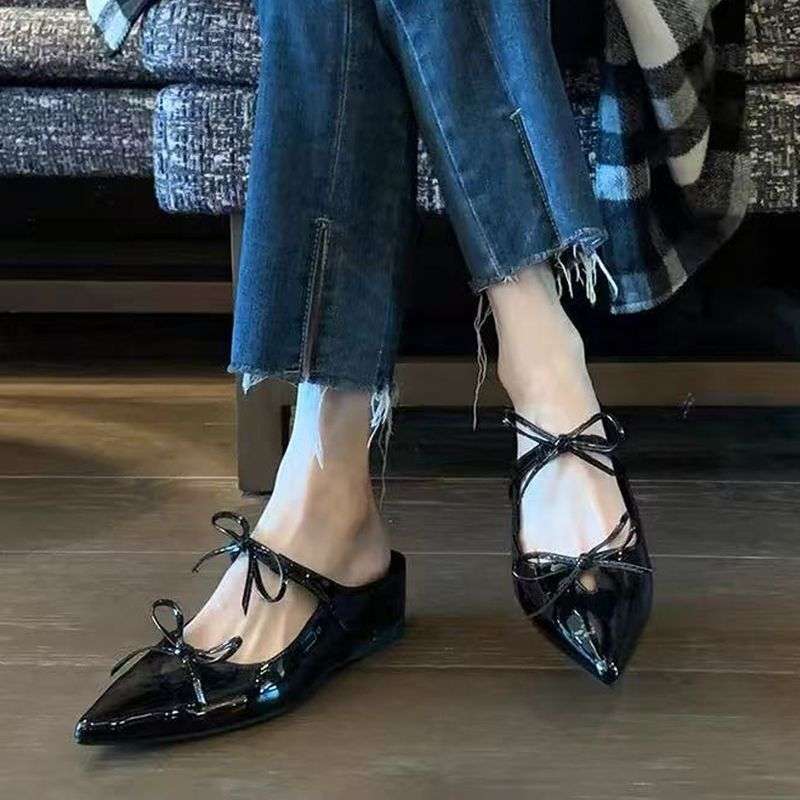春と夏の女性用の蝶結びの内側の高さを高めるつま先ハーフスリッパ、女性用のポインテッドトゥの靴、メリージェーンサンダル、フラットシューズ