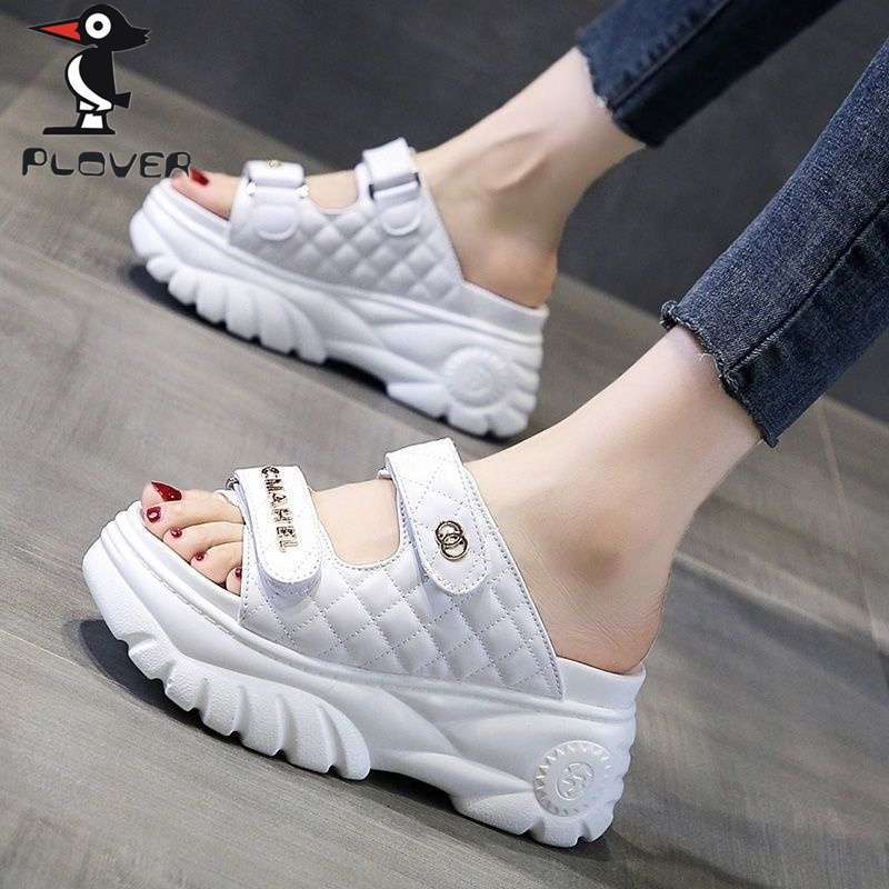 女性用サンダル、おしゃれなインファッション2025夏新作ベルクロ厚底インナー高さ増加プラットフォームスリッパ