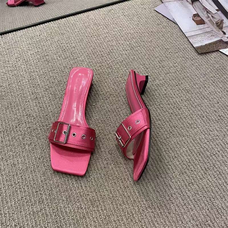 韓国風スクエアトゥビーチサンダル、ローズレッドスクエアバックル、スリムベルトバックル、スクエアヒール、エレガントなローヒールサンダル、女性用夏アウター